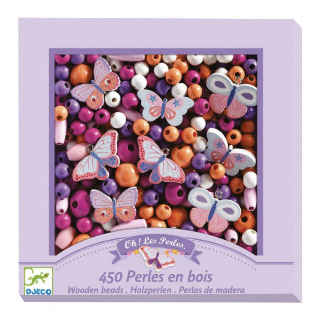 Use este belo conjunto de contas de madeira da Djeco para criar lindas joias! O conjunto inclui lindos encantos de borboletas e contas em rosas e roxos para fazer lindas pulseiras e colares personalizados!