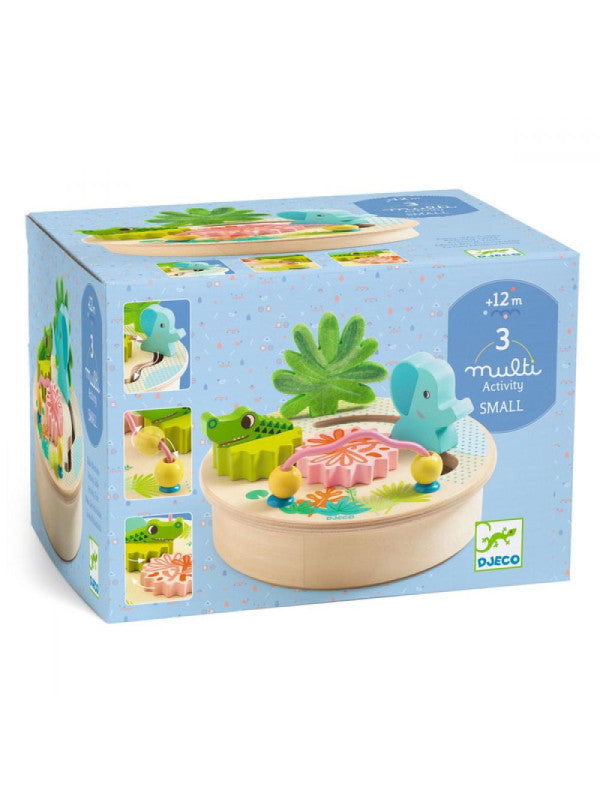 Uma pequena mesa de atividades em madeira natural com cores vibrantes, ideal para crianças a partir dos 12 meses. A mesa tem várias partes para brincar: mover as contas no ábaco, rodar as engrenagens e conduzir o elefante pelo caminho até o esconder atrás do arbusto.