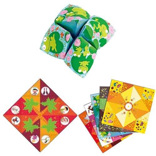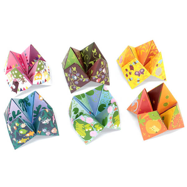 Este lindo pacote de papel de origami brilhante é uma ótima introdução para este ofício. A embalagem contém 24 folhas de papel e 3 folhas de adesivos;. Quando o pássaro de papel estiver dobrado, escolha 8 desafios e cole-os no papel. Insira os polegares e os dedos indicadores de cada mão sob o papel. Você está pronto para desafiar seus amigos. Peça a um amigo que forneça um número e veja o desafio que ele precisa fazer. Muito divertido para toda a família.