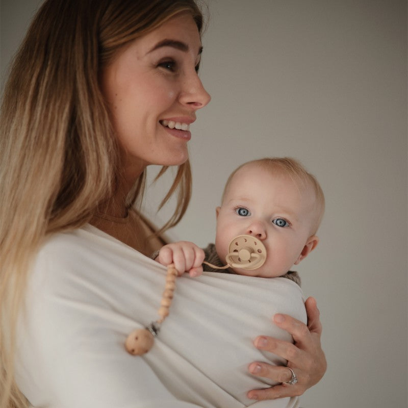 FRIGG Moon Phase é uma chupeta inspirada na Lua em movimento. As fases da lua em mudança são refletidas na estrutura da chupeta e funcionam como aberturas para ventilar a pele sensível do bebé. A inspiração da Fase da Lua continua na alça, em forma de meia-lua.