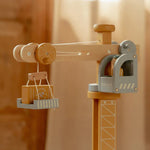 Construa e mova! Este guindaste de madeira levanta e baixa cargas em segurança. Inclui materiais de construção, veículos, operários da construção civil e sinais de trânsito. Perfeito para pequenos construtores e fácil de combinar com o conjunto de comboio XL!