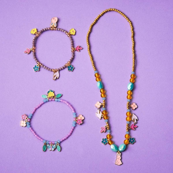 - O conjunto inclui 1 pulseira com contas em acrílico e 3 pendentes diferentes: borboleta, flor e folha de metal esmaltado.