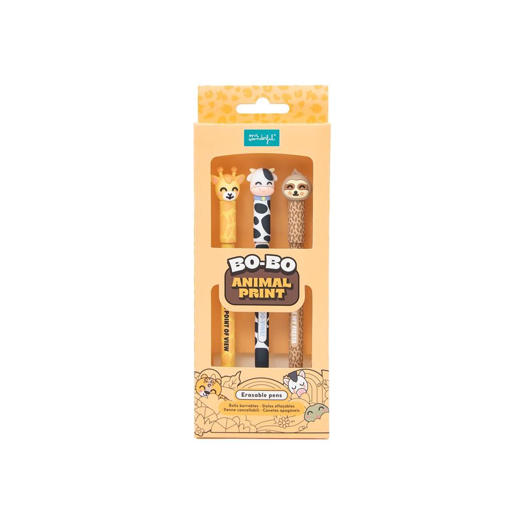 Set de 3 Esferográficas Apagáveis Bo-Bo - Animal Print - Girafa, Vaca e Preguiça - Mr. Wonderful