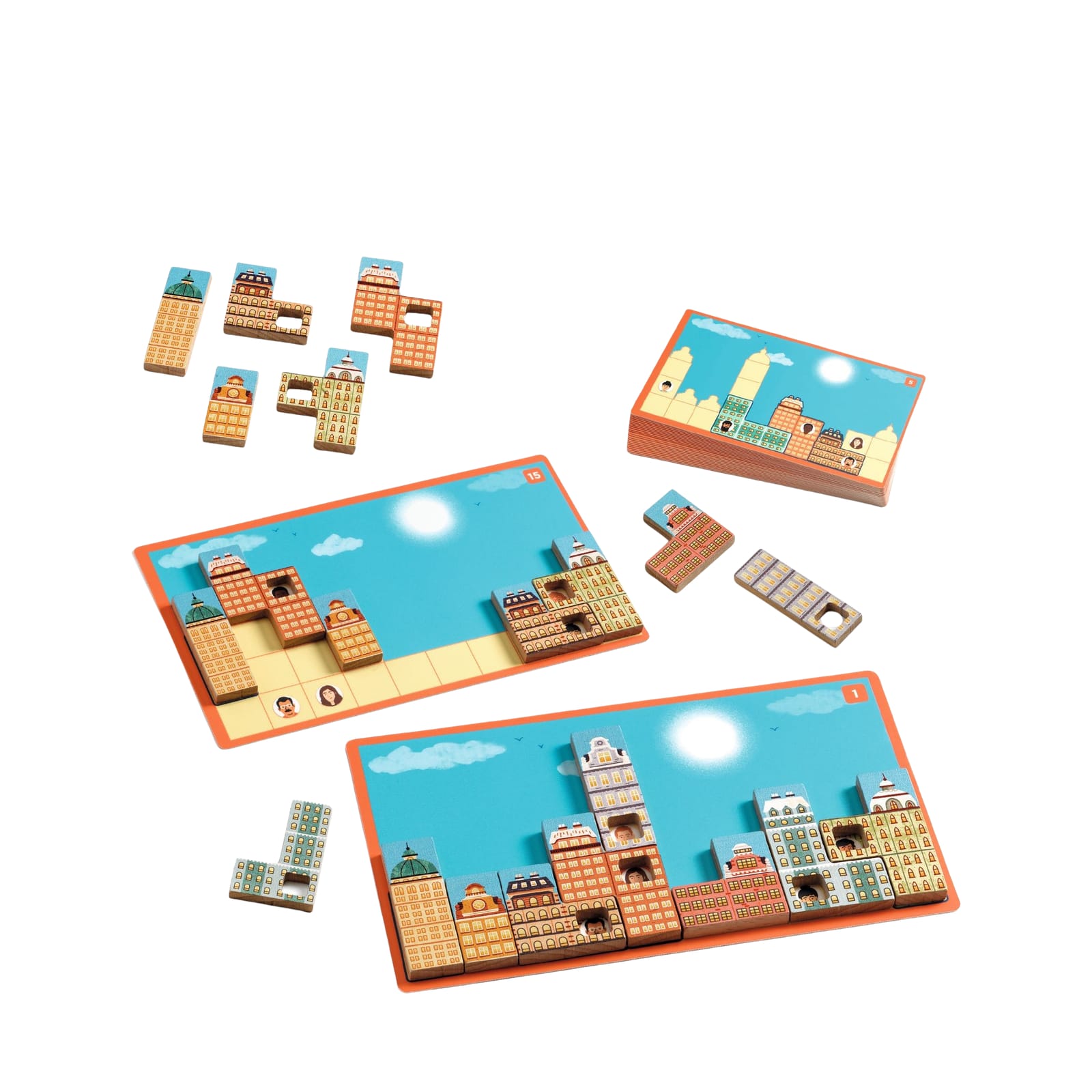 Eis aqui, pequeno arquiteto! Reconstrua os arranha-céus de uma grande cidade. Mas cuidado para não bloquear a vista dos moradores! Cada desafio exige que posicione 8 peças, com a frente ou o verso para cima, na horizontal ou na vertical.