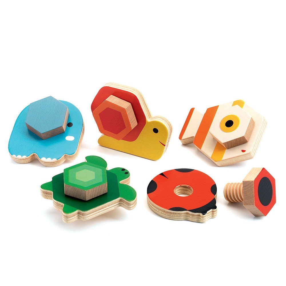 Puzzle de madeira com tartaruga, caracol, peixe, elefante e joaninha. Aparafuse os animais de combinação de cores. Ajuda as crianças a desenvolver suas habilidades e destreza desde a mais tenra idade.