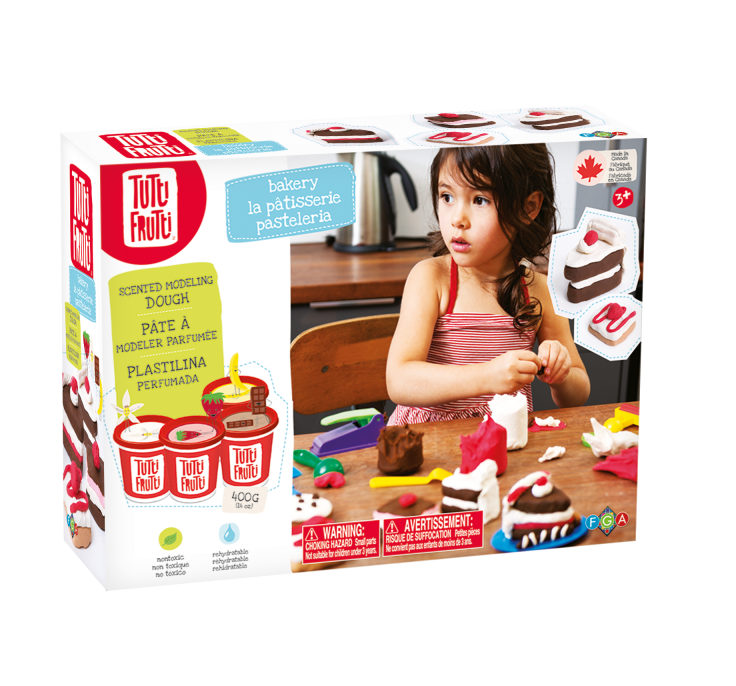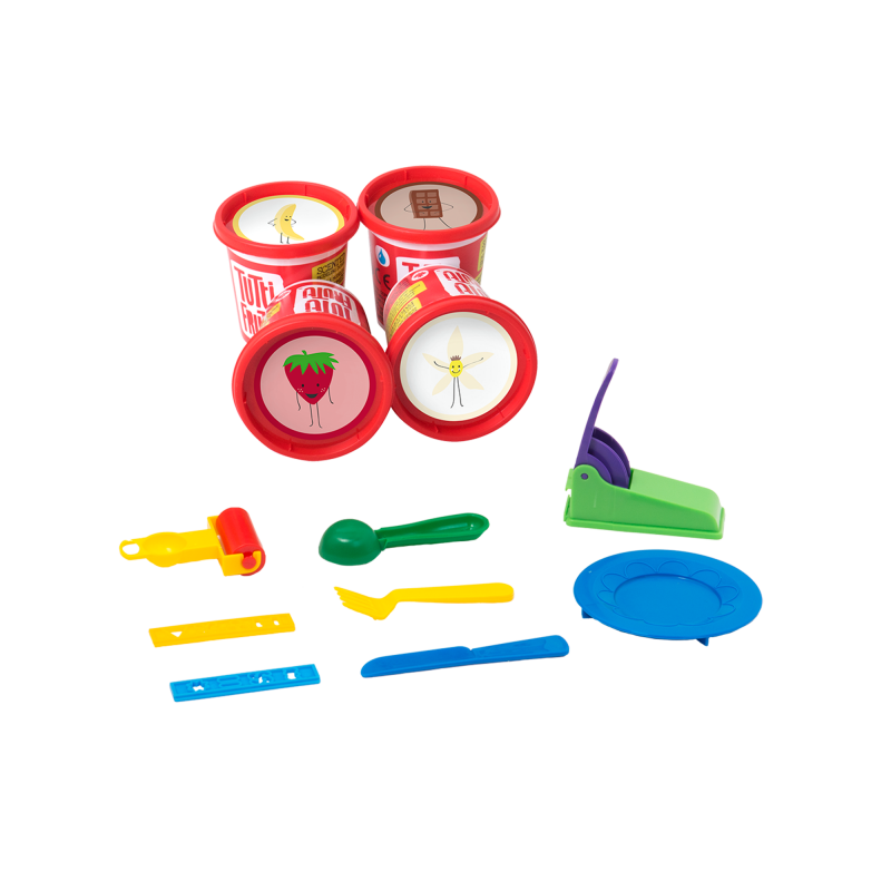 - 4 potes de 100g de plasticina aromatizada com baunilha, morango, chocolate e banana, colher plástica, faca, garfo, prato, rolo, moldes decorativos e prensa.