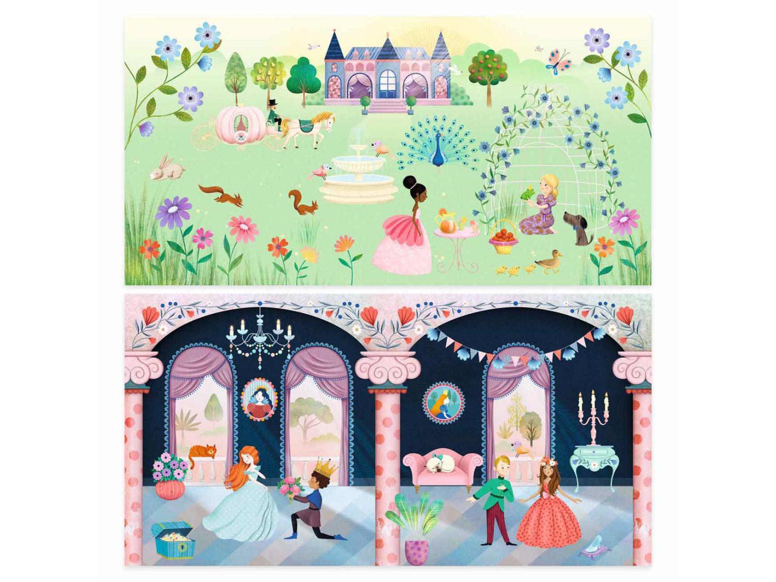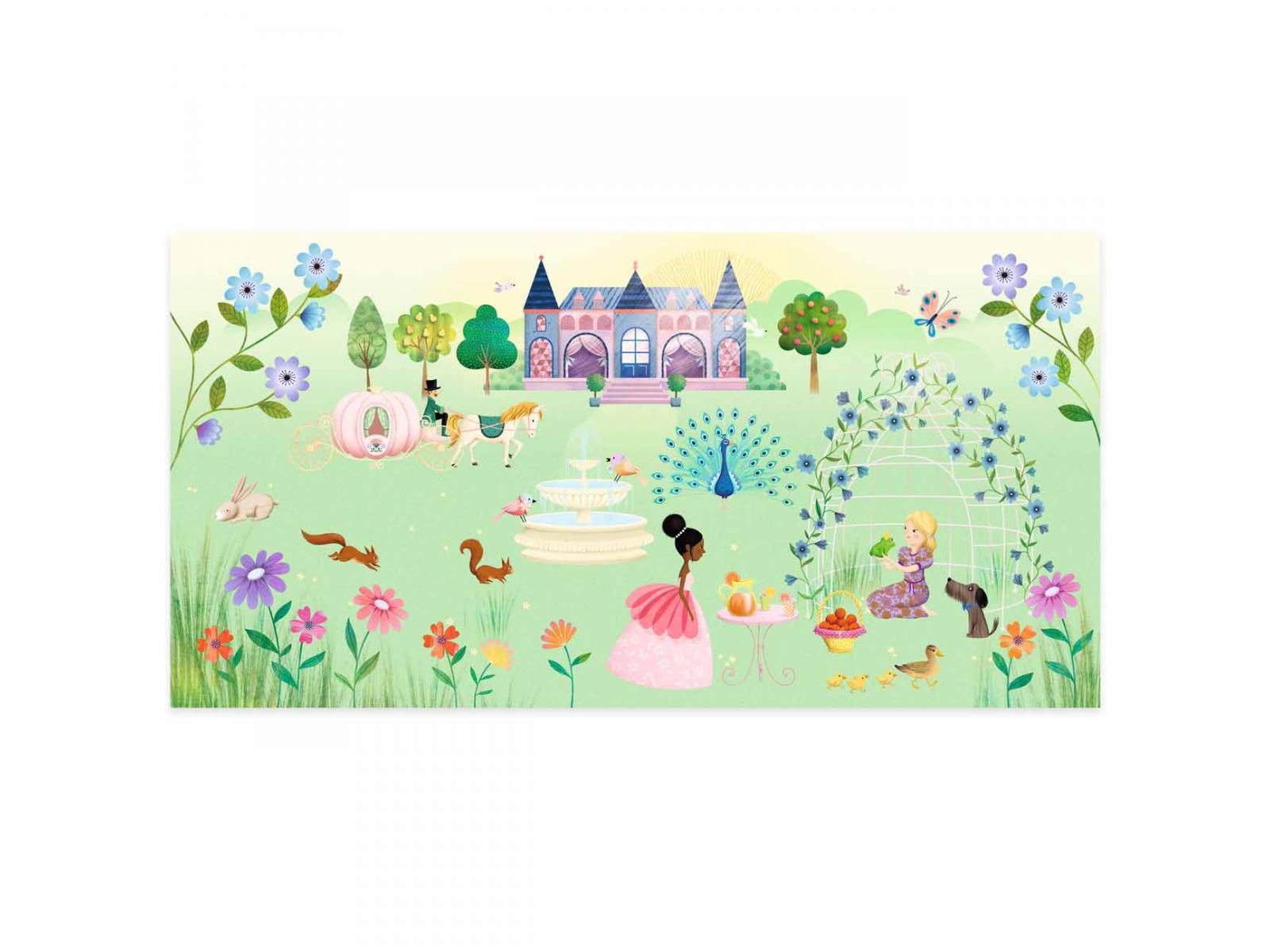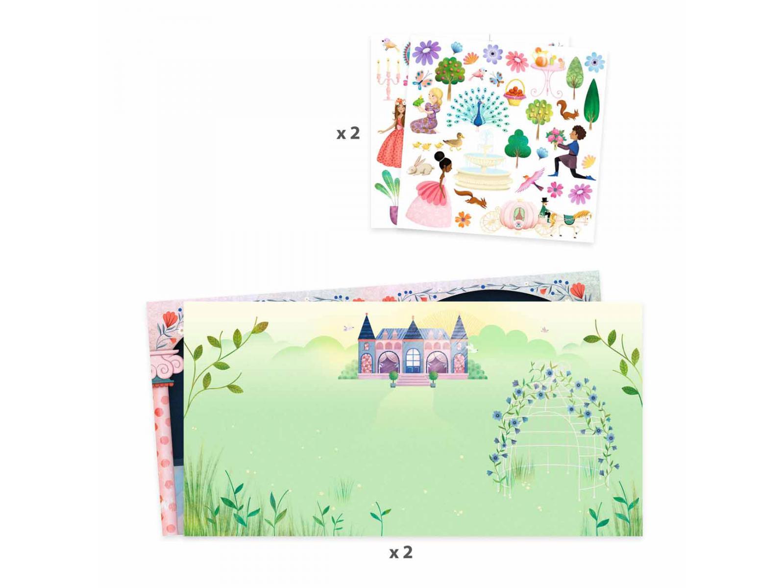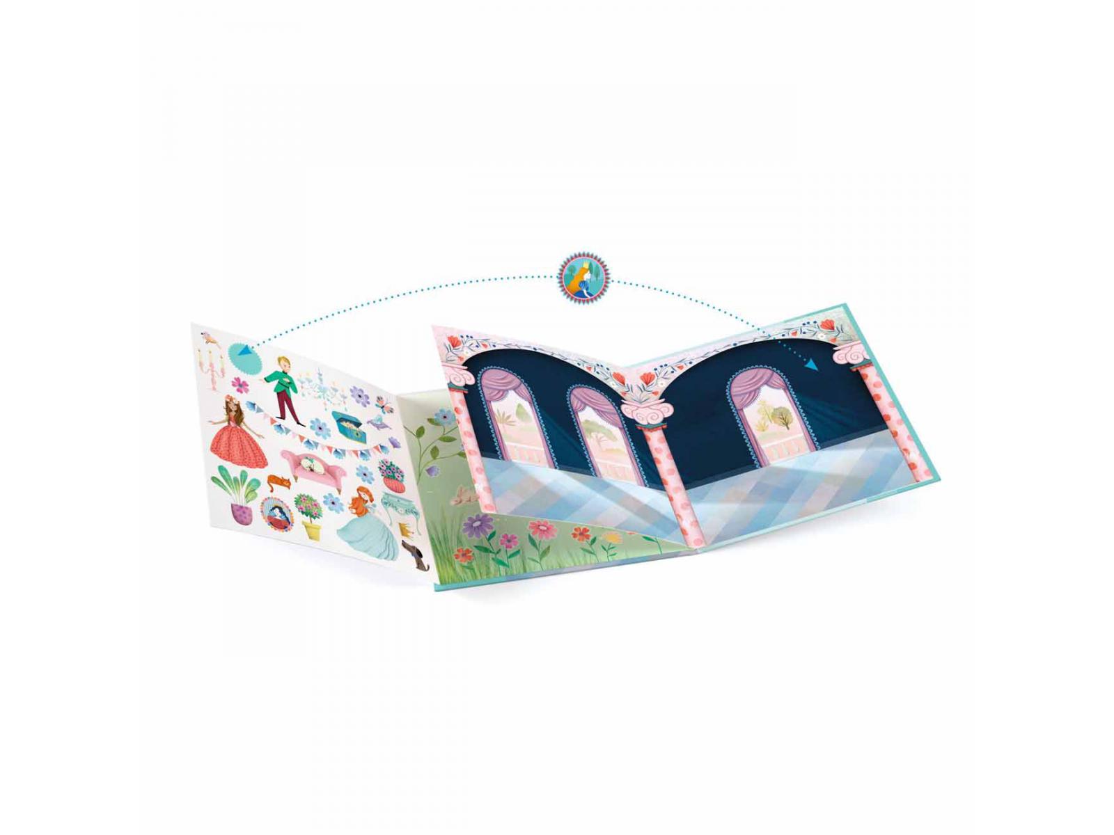 Adoráveis autocolantes Djeco com motivos de princesas, príncipes, flores e móveis. Está incluído um pequeno livro com duas páginas, onde um lado representa uma sala do castelo, enquanto o outro lado representa o jardim do castelo. Os adesivos Djeco podem ser colocados nas páginas do livro. A criança pode, portanto, criar sua própria história sobre o mundo dos contos de fadas das princesas e príncipes. Os adesivos podem ser usados repetidamente para que a história possa ser contada várias vezes.