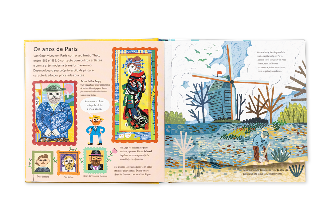 - A destacar: Os quadros mais famosos e os momentos mais marcantes da vida de Vincent Van Gogh, apresentados de forma cronológica; blocos de texto curtos, numa linguagem simples e acessível, adequada a várias idades; cinco pop-ups com elementos interativos das obras mais importantes de Vincent Van Gogh; citações do artista ao longo do livro, glossário de termos de arte e cronologia na última página.