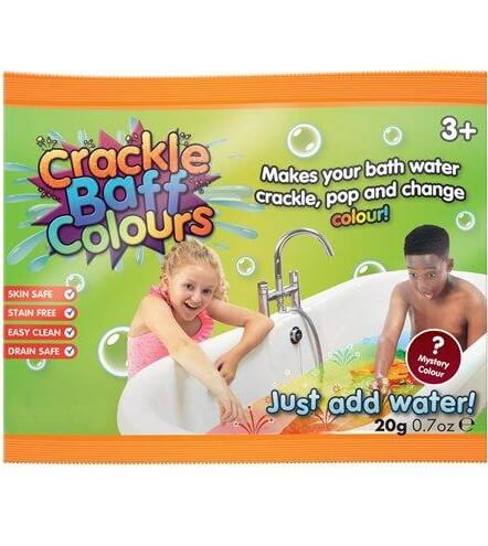 Adicione um pouco de emoção à hora do banho com Crackle Baff Colors! Polvilhe o pó sobre a água do banho e ouça-o estalar, rebentar e mudar de cor magicamente! Seguro para a pele - Seguro para drenagem - Limpeza fácil - Sem manchas. O nosso pó é certificado como biodegradável!